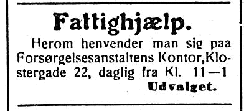 Annonce i Nakskov Tidende december 1915 Alderdomsunderstøttelse Samme år som loven om fattigvæsenet i 1891 blev vedtaget, gennemførtes også loven om alderdomsunderstøttelse. Denne lov betegnede et stort fremskridt. Det er endogså sagt, at Danmark ved denne kom til at stå som nummer ét mellem alle verdens stater med hensyn til omsorg for gamle. Loven giver hver trængende over 60 år ret til en årlig understøttelse, hvis han eller hun ikke de sidste 10 år har modtaget fattighjælp, og hvis han eller hun ikke er dømt for en i den offentlige mening vanærende handling. Tillige forlanges der også, at den trængende ikke er kommet i trang ved et uordentlig eller dårlig levned, eller ved at forære sin ejendom bort. Understøttelsen, der bevilges af kommunalbestyrelsen, kan bestå i naturalier eller i frit ophold på alderdomshjem og asyler; men i reglen udbetales den i penge. For Københavns vedkommende er det gennemsnitlige beløb, der uddeles omkring 200 kr. til hver person, i provinsbyerne 180 kr. og i landkommunerne omkring 110 kr. For tiden nyder 80 tusinde alderdomsunderstøttelse Det årlige beløb hertil er omkring 12 millioner kr. Pengene udbetales af kommunerne, men staten refunderer dog halvdelen af det udbetalte beløb. Der er mange, der hævder, at loven om alderdomsunderstøttelse gør skade, både ved at pålægge kommunerne store økonomiske byrder, og ved at opfordre den opvoksende slægt til ødselhed; den behøver jo ikke at spare, siges der. Når 60 års alderen er nået, kan der jo kræves understøttelse. Men de har ikke helt ret, de, der siger således. Loven gør meget godt. Der er mange hæderlige gamle, der efter at have slidt et helt liv, ærlig og redeligt fortjener den lille understøttelse, de får. Og det er mange tusinder, der ved denne lov er blevet fri for at ty til fattigvæsenet.